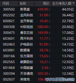 个股方面,新易盛获得逾44亿元主力资金净流入,金风科技获得逾36亿元净流入,金开新能、中际旭创获得超20亿元净流入,香农芯创、再升科技等9股也获得超10亿元净流入。